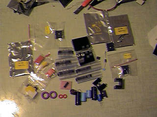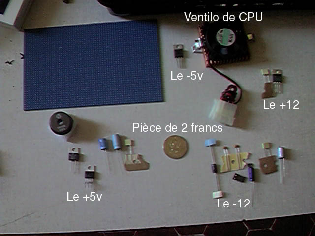 L'alimentation que je comptais faire au départ était une version modifiée de celle du player mp3 InMotion. Elle revient assez cher à cause des circuits de régulation MAXIM (150 francs pièce en France, il en faut au moins deux), mais on peut les obtenir gratuitement à l'adresse suivante ???, en indiquant surtout que l'on fait une profession sérieuse (ingénieur, professeur, pas étudiant !). Voici la photo du kit avant montage. La pièce de deux francs indique l'échelle. Ca ne devrait pas prendre beaucoup de place au final. Par rapport au plan de InMotion, Patrice compte rajouter deux circuits d'alim +5v et un +12V en plus pour alimenter un HD ou un lecteur de CD séparément de la carte mère, et des filtres antiparasites. Plus d'infos bientôt, Patrice doit me l'assembler en fin de semaine prochaine !