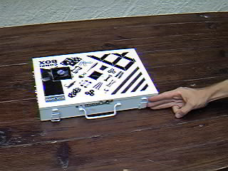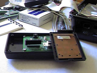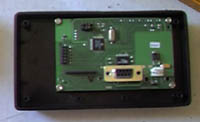 Voici quelques photos de l'écran, installé dans un boitier ISO acheté 29 francs dans un magasin d'éléctronique. Il s'agit d'un boitier plastique s'ouvrant en deux (4 vis), dans lequel j'ai fait une découpe. La technique utilisée pour faire la découpe est la suivante : tout d'abord, percer à la chignole à main 4 trous aux angles de la zone rectangulaire que l'on doit découper, légèrement en retrait, ensuite, découpage à l'aide d'un gros cutter du rectangle, puis ajuster et araser les bords à l'aide d'une lime. Ensuite, une fois l'écran inséré dans la découpe, l'enlever puis retirer les vis qui servent à fixer les deux PCBs de l'écran. Le remettre en place, repèrer en enfilant de l'intérieur la chignole dans les trous correspondants aux vis retirées les endroits à percer en faisant une petite marque. Enlever l'écran, percer, araser les 4 trous, remettre les vis. Ca y est, l'écran est fixé !