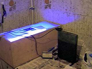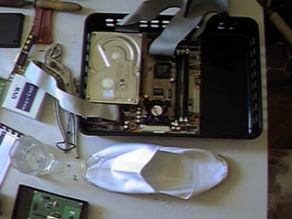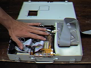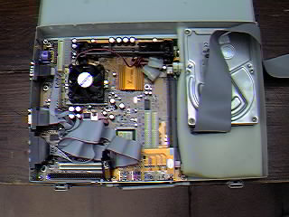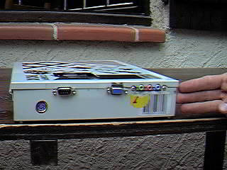 La carte mère que j'utilisais au début pour mes essais est une ASUS baby AT P5-A-B d'il y a deux ans avec un Pentium 100. Le HD est un 3.5 pouces Quantum Bigfoot de récup. Le boitier me permet juste de poser le tout sur une table ou sur le siège de la voiture lorsque je faisais mes essais : il s'agit d'un bac à légumes acheté 16 francs à Carefour! Malgré tout, et bien que le boitier soit bien trop grand, ça permet de se faire une idée des premiers essais.