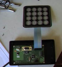 Par exemple, ce clavier plat, de marque C&K Components, part number 4244A1 chez Digikey (PN. CKN6011-ND $21.52 USD), souple, auto-collant (il suffit d'enlever la bande de protection à l'arrière pour le coller), équipé d'une nappe et d'un connecteur se branchant directement sur le connecteur clavier de l'écran LCD. Coût avec frais de livraison : environ 150 francs, deux semaines de délai pour être livré en France. Paiement direct avec confirmation par mail ensuite. Principal défaut : sa taille. Il est à mon goût un peu trop gros. Testé avec le soft de Cajun, fonctionne parfaitement. On peut l'auto-coller directement sur le tableau de bord de la voiture, il suffit d'enlever la bande adhésive à l'arrière.