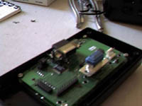 Dernière nouvelles (cf les news en haut de la page) : j'ai changé ce boitier assez vilain pour un boitier acheté chez Radiospares, contenant pile poil cet écran + un clavier ligne/colonne de type alarme. J'ai payé le mien 39 francs et on devrait le trouver dans toutes les boutiques d'électronique. Vous gourrez pas, demandez le mode d'adressage ligne/colonne et non pas le mode 'point commun', pour vérifier, le nombre de pines à l'arrière doit être égal au nombre de lignes + nombre de colonnes de votre clavier. Par exemple 7 pines pour 4 lignes et 3 colonnes. Pour que l'écran entre dans ce boitier, j'ai dû remplacer la prise db9 située à l'arrière par une prise coudée.
