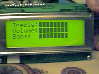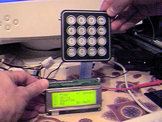 L'écran LCD que j'ai choisi pour mon application est un Matrix Orbital référence LK204-25v, capable d'afficher 20 caractères sur 4 lignes. Il possède deux tailles de caractères prédéfinis et offre la possibilité d'envoyer ses propres caractères (icônes) et d'afficher des bar-graphs verticaux ou horizontaux (cool...voir la photo !). Il se branche sur un port série DB9 en plug and play, et permet de brancher un clavier directement sur sa carte.