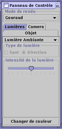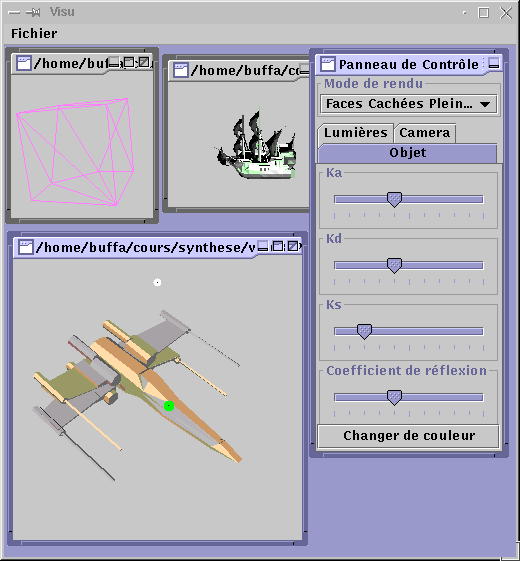 Comme vous pouvez le voir, il s'agit d'une application multi-fenetres, possèdant une barre de menu et un tableau de controle pour les objets, les lumières et les caméras associées à chaque objet.