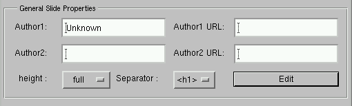 The template file is an ASCII file you can edit with emacs. It contains all the properties you want to apply to your slides. For futher details and a complete description of all properties, you can have a look on the full description of whole properties. Here are only some examples :
