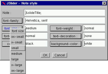 JSlider is a powerfull tool written in Java (v.1.1) that generates HTML slides with your personnal presentations style. The initial version was made by Stephan Montigaud for the W3C. It uses standard style sheets that you can overload with your own. It automatically adds a table of contents, navigation buttons to cycle through different slides and other cool stuffs.