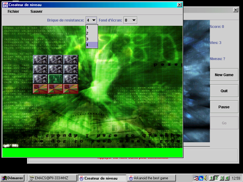Un editeur a ete ajoute. Celui-ci permet de creer des parties entieres, avec au maximum 12 niveaux qui peuvent etre crees. Pour cela il suffit d'aller dans le menu Options et de clicker sur Creation manuelle. Ensuite vous pouvez choisir differents fond d'ecran, ainsi que les differentes briques avec leurs resistance respective (voir plus haut). Pour creer un niveau il faut d'abord creer une partie, dans le menu fichier de l'editeur (actuellement cette version ne permet de sauvegarde qu'une seule partie cree). Ensuite creer les differents niveaux en placant des briques a l'aide du bouton gauche de la souris, ou de les supprimer avec le bouton droit, puis de sauvegarder ce niveau, grace au menu Sauver-> Enregistrer niveau. Lorsque vous avez fini de creer vos differents niveaux (12 aux maximum), enregistrer la partie grace au menu Sauver -> Enregistrer partie.