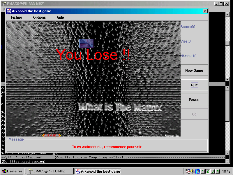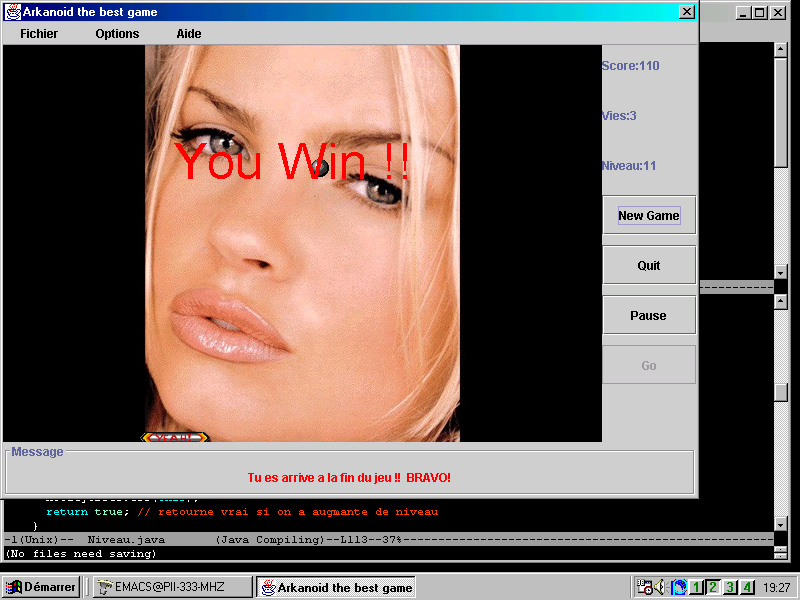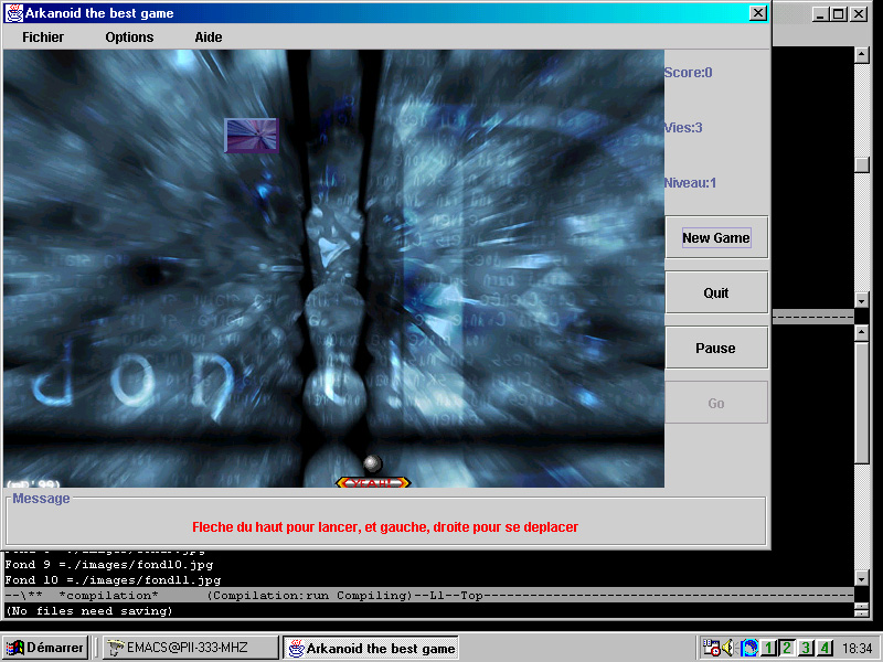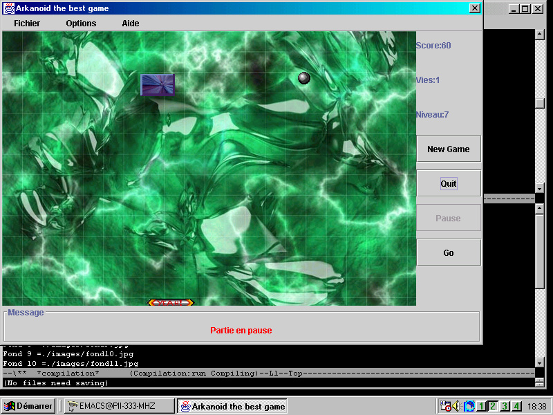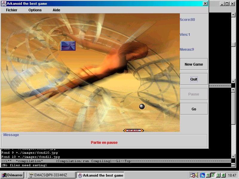 Sous Unix la taille du panel n'est pas identique et la balle sort un peu de l'ecran. De plus lors de la compilation il y a des Out Of Memory Error dues probablement aux images chargees au debut.