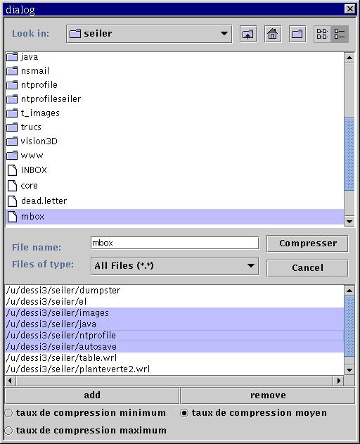 Une magnifique fenêtre apparaît afin de vous permettre d'établir une liste de fichiers ou de répertoires à ajouter à votre archive. Si vous vous êtes trompés dans la liste, pas de problème, on peut ajouter mais aussi effacer une sélection. Cette fenêtre permettra également de définir le taux de compression de l'archive une fois les fichiers ajoutés.