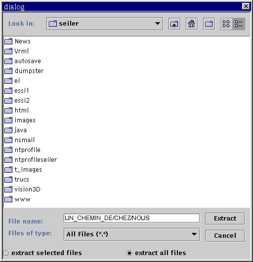 On vous demandera de préciser seulement le nom du répertoire (existant ou non) où vous désirez mettre le contenu de l'archive et de choisir entre deux boutons afin de savoir si vous voulez extraire tout le contenu de l'archive ou seulement les fichiers sélectionnés dans la table de la fenêtre principale.