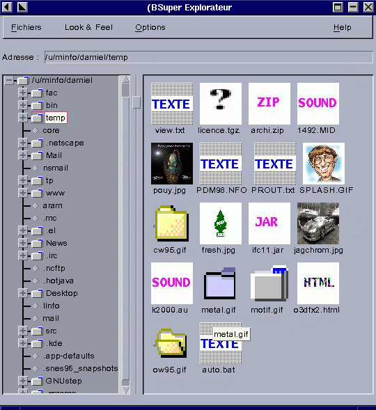 Previsualisation des fichiers sous forme d' icones representatives du type de fichier (image, sons, texte), dans le cas d'un fichier image, celui-ci est affichee en reduction a l' interieur de l'icone ceci facilitant leur recherche.