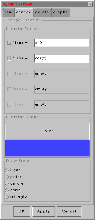 Ce petit logiciel permet de dessiner des fonctions dans un repére donné. Il a été réalisé entierement en Java (Version 1.2) .La version existente est une aplication. Donc il vous faut java1.2 (how to get it) pour pourvoir le lancer.