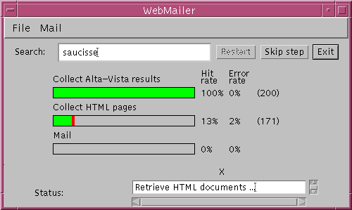 WebMailer est une application ecrite en Java, destinee a faire du mailing cible. Exemple je viens de monter un serveur WEB pour vendre des saucisses. J'ai envie de signaler à tous les webmasters qui maintiennent des pages relatives aux saucisses l'existence de mon serveur. Comment automatiser cela ? La solution consiste à écrire un programme qui interroge par exemple Altavista en lui demandant quelles sont les pages qui parlent de saucisses, puis de parser les réponses pour ne conserver que les URL des pages. Ensuite, aller visiter une à une les pages et récupérer les adresses emails des personnens qui maintiennent ces pages. Puis finalement leur envoyer un mail d'info concernant la création de mon site sur les saucisses. Le faire à la main peut prendre plusieurs heures, avec le système automatique, ca devrait prendre 5 minutes.