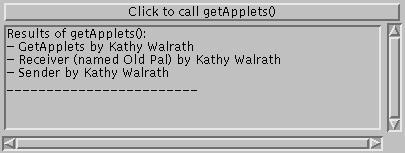 ) to the receiver. For example:((Receiver)receiver).startCommunicating(this);Finding All the Applets on a Page: The getApplets Method