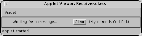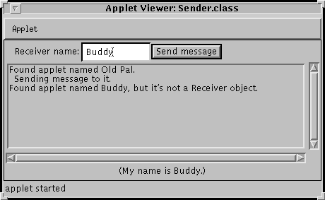 ). If all goes well, the Sender sends a message to the Receiver. (Here's the Receiver program.)if (receiver != null) { //Use the instanceof operator to make sure the applet //we found is a Receiver object. if (!(receiver instanceof Receiver)) { status.appendText("Found applet named " + receiverName + ", " + "but it's not a Receiver object.\n"); } else { status.appendText("Found applet named " + receiverName + ".\n" + " Sending message to it.\n"); //Cast the receiver to be a Receiver object //(instead of just an Applet object) so that the //compiler will let us call a Receiver method. ((Receiver)receiver).processRequestFrom(myName); } } . . .From an applet's point of view, its name is stored in a parameter named