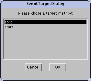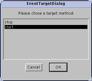 Now drag the event line from the button source to the Juggler Bean target. Press and release the mouse button with the connection line over the Juggler. You'll now see the dialog of applicable event-handler methods defined for the Juggler Bean.