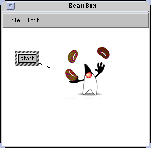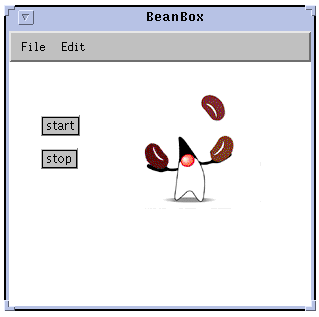 The easiest way to understand how BeanBox works is to use it. You can construct simple beans applications without writing any Java code using BeanBox. As a first example, you can build a simple "Juggling Duke" application in which Duke will start or stop juggling depending on which of two buttons you push.