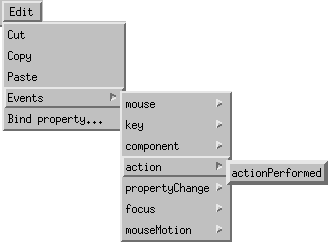 Once the actionPerformed menu selection is made, BeanBox enters a state where a line emanates from the start button and follows the mouse as you move it around the window. This indicates that the button is the selected source for the action event, and that your next mouse press should be over the target which defines appropriate event-handler methods, in this case the Juggler.