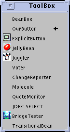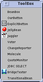 In the case of BeanBox, however, the main purpose is to test Beans and verify that introspection and event hookup works properly. The idea of running an application doesn't really make sense for BeanBox. Think of BeanBox as a reference builder tool. If your bean runs properly in BeanBox, and reports the proper events that you want your bean to fire as well as the proper event handlers for events you want it to respond to, you can be confident that your bean will work properly in other Beans-enabled builder tools.