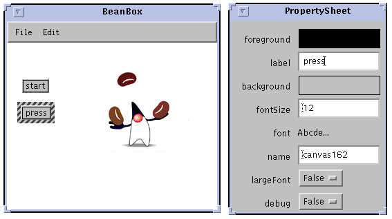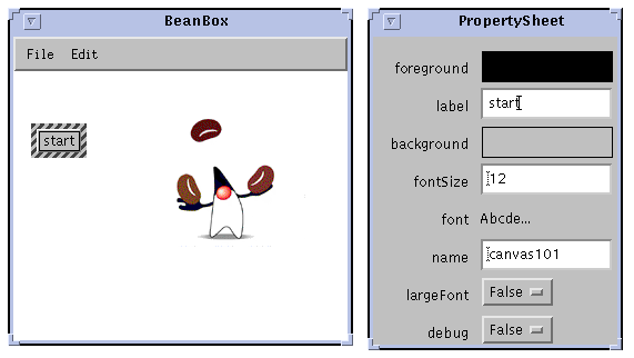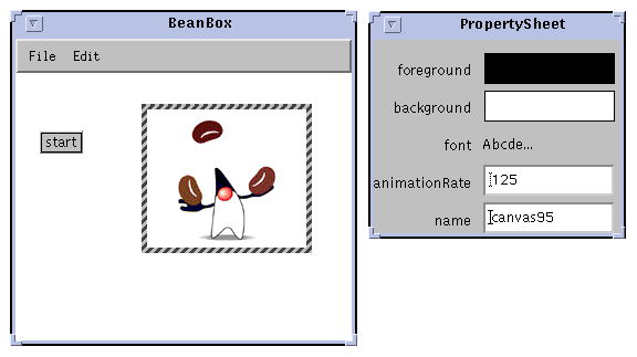 In most builder tools the distinction between design time and run time is a little more clear. When a bean application is running, you wouldn't normally have access to the property sheet to edit properties. In the case of the Juggler, that means there would be no way to change the juggling speed while the application is running, until a scrollbar is added, and the proper events and handlers hooked up. With the current implementation, you would have to stop the application, edit the animationRate property to change the speed, then relaunch the application. Needless to say, this is not a good interactive design for most applications.