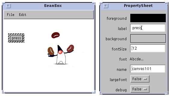 A good exercise, at this point, would be to make it possible to control the Juggler's speed with a Scrollbar bean instead of by editing the numberic field in the Property editor. This project points to an important distinction not made in BeanBox but made by other builder tools.