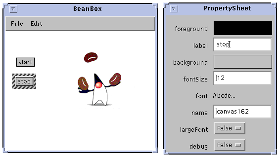 Next, you'll need to add a start button and a stop button to control the juggler. Each of these Beans is an instance of the OurButton Bean class.