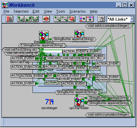 However not all programs require text editing. As mentioned, the calcualtor example was built without resorting to text coding. The maze of links required to hookup components can be overwhelming, as you can see in the following figure.