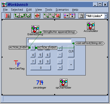 The calculator was built without writing any Java code. Instead, components were linked by using a mouse. Generated events and event-handler methods were selected through pop-up menus.