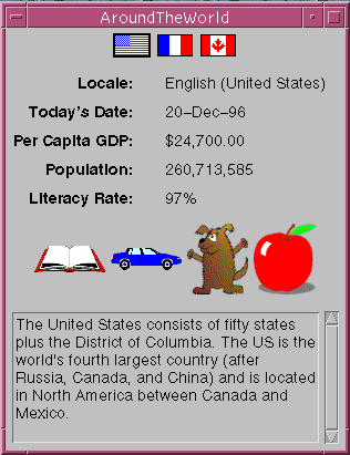 The JDK 1.1 release of Java added several features to the Java language and the class packages to help you write global programs. That is, programs that tailor themselves to the user's customs and language. The applet running below, called AroundTheWorld, uses these new features of the JDK to display information about various places in the world in a way that is appropriate for users in that area.
