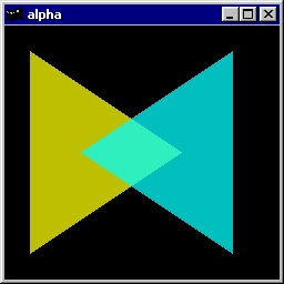 This program draws several overlapping filled polygons to demonstrate the effect order has on alpha blending results. Use the 't' key to toggle the order of drawing polygons. Source code: alpha.c. |