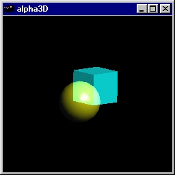 This program demonstrates how to intermix opaque and alpha blended polygons in the same scene, by using glDepthMask. Press the 'a' key to animate moving the transparent object through the opaque object. Press the 'r' key to reset the scene. Source code: alpha3D.c. |