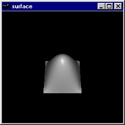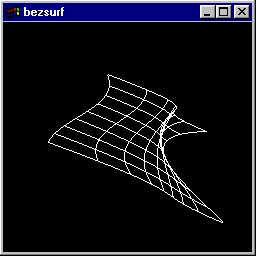 This program draws a NURBS surface in the shape of a symmetrical hill. Source code: surface.c. |