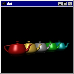 This program demonstrates use of the accumulation buffer to create an out-of-focus depth-of-field effect. The teapots are drawn several times into the accumulation buffer. The viewing volume is jittered, except at the focal point, where the viewing volume is at the same position, each time. In this case, the gold teapot remains in focus. Source code: dof.c. |