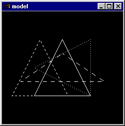 This is an illustration of the selection mode and name stack, which detects whether objects which collide with a viewing volume. First, four triangles and a rectangular box representing a viewing volume are drawn (drawScene routine). The green triangle and yellow triangles appear to lie within the viewing volume, but the red triangle appears to lie outside it. Then the selection mode is entered (selectObjects routine). Drawing to the screen ceases. To see if any collisions occur, the four triangles are called. In this example, the green triangle causes one hit with the name 1, and the yellow triangles cause one hit with the name 3. Source code: select.c. |