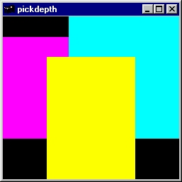 Picking is demonstrated in this program. In rendering mode, three overlapping rectangles are drawn. When the left mouse button is pressed, selection mode is entered with the picking matrix. Rectangles which are drawn under the cursor position are "picked." Pay special attention to the depth value range, which is returned. Source code: pickdepth.c. |