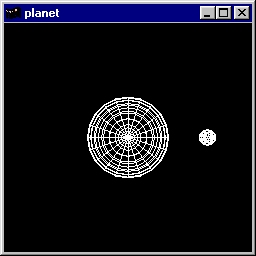 This program shows how to composite modeling transformations to draw translated and rotated models. Interaction: pressing the d and y keys (day and year) alters the rotation of the planet around the sun. Source code: planet.c. |