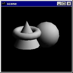 This program demonstrates the use of the GL lighting model. Objects are drawn using a grey material characteristic. A single light source illuminates the objects. Source code: scene.c. |