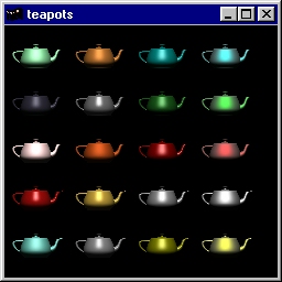 This program demonstrates lots of material properties. A single light source illuminates the objects. Source code: teapots.c. |
