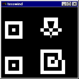 This program demonstrates the winding rule polygon tessellation property. Four tessellated objects are drawn, each with very different contours. When the w key is pressed, the objects are drawn with a different winding rule. Source code: tesswind.c. |