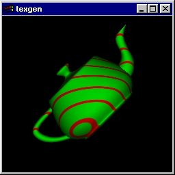 This program draws a texture mapped teapot with automatically generated texture coordinates. The texture is rendered as stripes on the teapot. Initially, the object is drawn with texture coordinates based upon the object coordinates of the vertex and distance from the plane x = 0. Pressing the 'e' key changes the coordinate generation to eye coordinates of the vertex. Pressing the 'o' key switches it back to the object coordinates. Pressing the 's' key changes the plane to a slanted one (x + y + z = 0). Pressing the 'x' key switches it back to x = 0. Source code: texgen.c. |