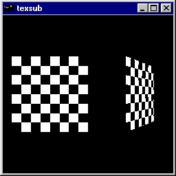 This program texture maps a checkerboard image onto two rectangles. This program clamps the texture, if the texture coordinates fall outside 0.0 and 1.0. If the s key is pressed, a texture subimage is used to alter the original texture. If the r key is pressed, the original texture is restored. Source code: texsub.c. |