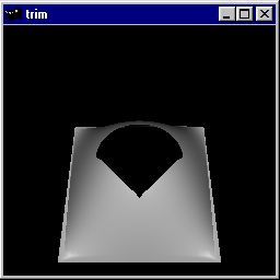 This program draws a NURBS surface in the shape of a symmetrical hill, using both a NURBS curve and pwl (piecewise linear) curve to trim part of the surface. Source code: trim.c. |