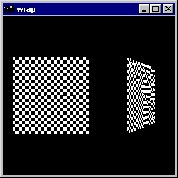This program texture maps a checkerboard image onto two rectangles. This program demonstrates the wrapping modes, if the texture coordinates fall outside 0.0 and 1.0. Interaction: Pressing the 's' and 'S' keys switch the wrapping between clamping and repeating for the s parameter. The 't' and 'T' keys control the wrapping for the t parameter. If running this program on OpenGL 1.0, texture objects are not used. Source code: wrap.c. |