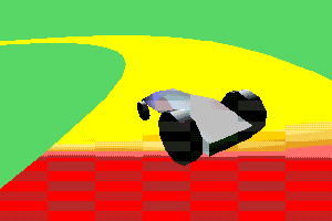 Une voiture (pas trés jolie) qui avance sur un circuit (ou à l'exterieur).