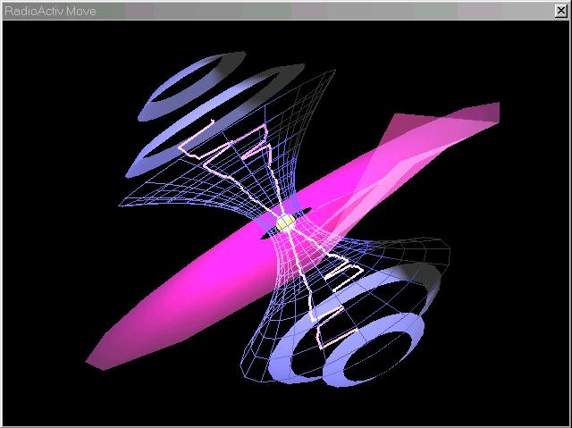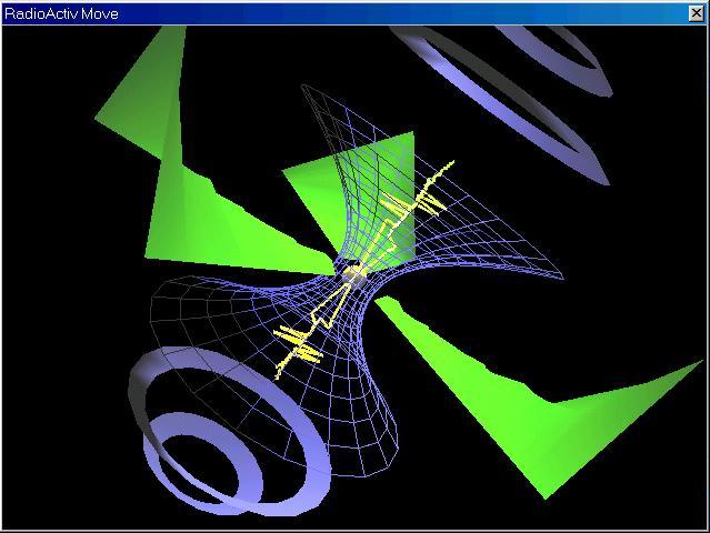Vous pourrez voir un diabolo qui tourne entouré de composants qui bougent sur la musique. RadioactiV dispose de plusieurs sortes de composants qui bougent autour du diabolo. La plupart utilise la technique du blending , qui donne des effets de transparence.