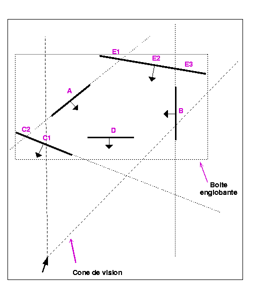 On numerote les faces par des caractéres alphabétiques, et on les traite l'une aprés l'autre (on les fait rentrer dans l'arbre), par ordre alphabétique. C'est à dire qu'on les découpe en morceaux numérotés si besoin (un segment précédent existe déjà). A chaque segment qu'on ajoute, on découpe la boite englobante en 2 autres boites englobantes. Essayez de reconstituer l'arbre ci dessous, à l'aide de la scéne ci contre par ordre alphabétique. arbre obtenu :