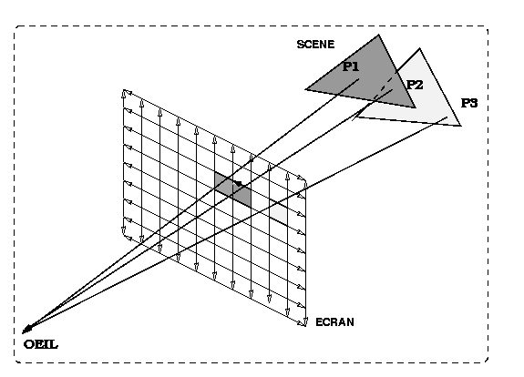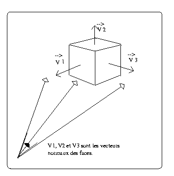 Pour cela, on calcule les normales de toutes les faces, et on les compare à l'angle de la caméra. soient v1 et v2, 2 vecteurs de la face incriminée, on calcule le vecteur N normal à la face par :