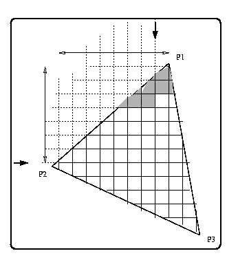 Toutes les faces sont balayées par un filtre bilinéaire : c'est à dire par un passage d'abord horizontal et ensuite vertical sur tous les pixels du triangle, afin qu'ils soient projettés sur l'écran (et pas seulement leur centre et leurs coins). |