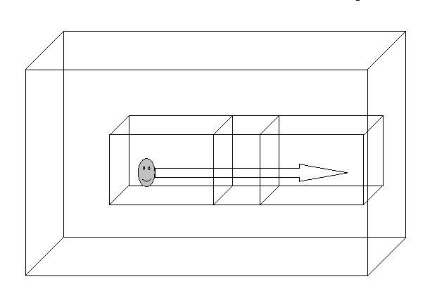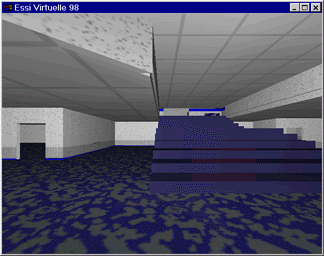 Le principe consistait à dire que nous nous trouvions dans une feuille, ce qui est pour le moins évident puisque où que nous nous trouvions dans le niveau notre position correspondait à l'emplacement d'une feuille dans l'arbre. Ainsi on pouvait tester toutes collisions éventuelles avec l'une des faces qui se trouvait dans cette feuille. Ensuite si l'on pouvait sortir de cette feuille, on cherchait la feuille dans laquelle on devait se trouver après l'éventuel déplacement et on effectuait les mêmes tests sur cette nouvelle feuille. ![]() Le premier problème survenu est que certaines feuilles représentent un volume spatial si petit que celles-ci n'étaient pas testées. On pouvait donc passer à travers certains murs qui semblait ne pas exister!!! ![]() Le deuxième problème était encore bien plus ennuyeux puisqu'il s'agissait de détecter la présence ou non d'un sol sous nos pieds. A priori rien de bien complexe. Il suffisait de tester les faces de la feuille où l'on se trouvait qui possède une normale en z ( i.e. vers le haut). La surprise que nous réservait le BSP était que certaines feuilles sont coupées horizontalement, surtout lorsqu'on s'approchait des marches, ce qui devenait encore plus problématique pour gérer la montée des marches. En effet, le test pour trouver dans quelle feuille l'on se trouvait s'effectuait au niveau de la caméra. On se retrouvait donc dans certaines feuilles sans sol ni plafond.... ![]() Les tests ont encore continués pour trouver une méthode s'adaptant à ces problèmes. Mais de nouveaux problèmes sont alors apparus toujours dus à la spécificité du BSP et à la façon dont il est construit. Il s'est donc avéré que le peu de connaissance que nous avions au sujet de la construction de l'arbre par rapport à la modélisation de l'ESSI, le peu de documents disponibles quant à cette même construction et à la façon dont la détection de collision est effectuée ne permettait pas d'utiliser cette méthode là de manière efficace.