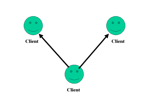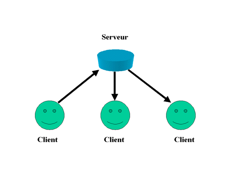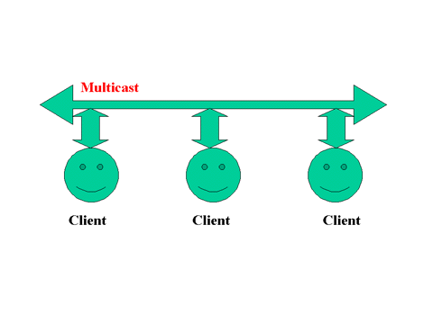 Une autre approche Unicast:Un client diffuse successivement à tous les clients. Pour 1 message, et N clients, il envoie N paquets.![]() L'approche unicast nécessite d'envoyer autant de messages qu'il existe de processus destination, ce qui peut entraîner une surcharge importante du réseau et donc un temps de latence élevé. Approche multicast ou broadcast:Un client diffuse à tous les clients, tel un émetteur radio. Pour 1 message et N clients, il envoie 1 Paquet.![]() L'avantage majeur d'une approche Broadcast/Multicast réside dans
