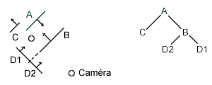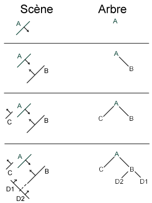 Dans cet exemple chaque noeud de l'arbre contient un segment qui correspondra à une facette verticale orientée par sa normale. L'espace (ici le plan) sera partitionné par la droite associée au segment courant. Pour créer un arbre BSP on commence par prendre le premier segment et le placer à la racine de l'arbre. Ensuite on insère dans l'arbre un noeud pour chaque segment de la scène. L'arbre étant binaire, chaque noeud a deux fils : un pour les segments se trouvant devant le segment courant et un autre pour les segments se trouvant derrière. ![]() Dans cet exemple les segments (B et D) se trouvant devant la facette A sont placés à sa droite dans l'arbre et les segments (C) se trouvant derrière sont placés à gauche. Nous pouvons aussi remarquer que le segment D se trouve à la fois devant et derrière le segment B. Le segment D est donc découpé en deux segments : D1 se trouvant devant B et D2 se trouvant derrière B. Ensuite pour afficher la scène on va parcourir l'arbre de manière récursive. Pour chaque noeud de l'arbre on va comparer la position de la caméra avec le segment courant : si la caméra est devant le segment associé au noeud courant on procédera à l'affichage des segments se trouvant derrière le segment courant en premier. Ensuite, on affichera ceux se trouvant devant. Si la caméra est derrière le segment courant on affiche d'abord les segments se trouvant devant, puis ceux se trouvant derrière. Dans notre exemple : ![]() La caméra est devant A on va donc afficher C, puis A, puis passer au noeud contenant B. La caméra se trouve devant B on va donc afficher D2, puis B et pour finir D1.